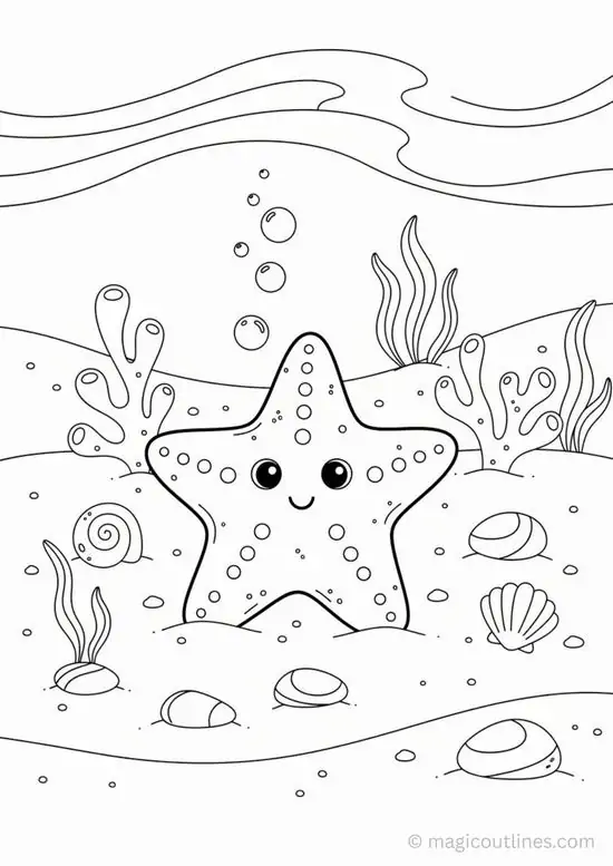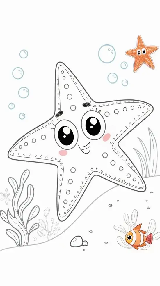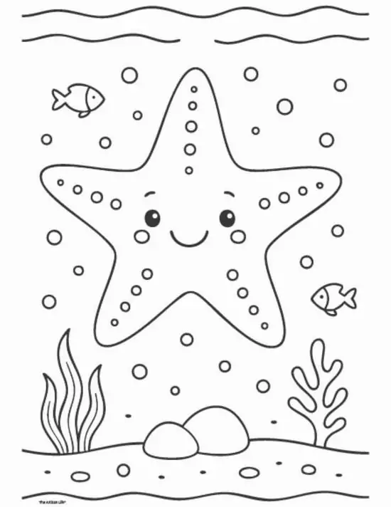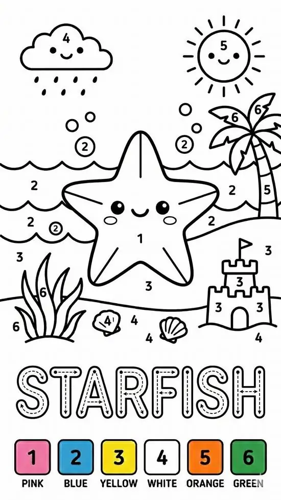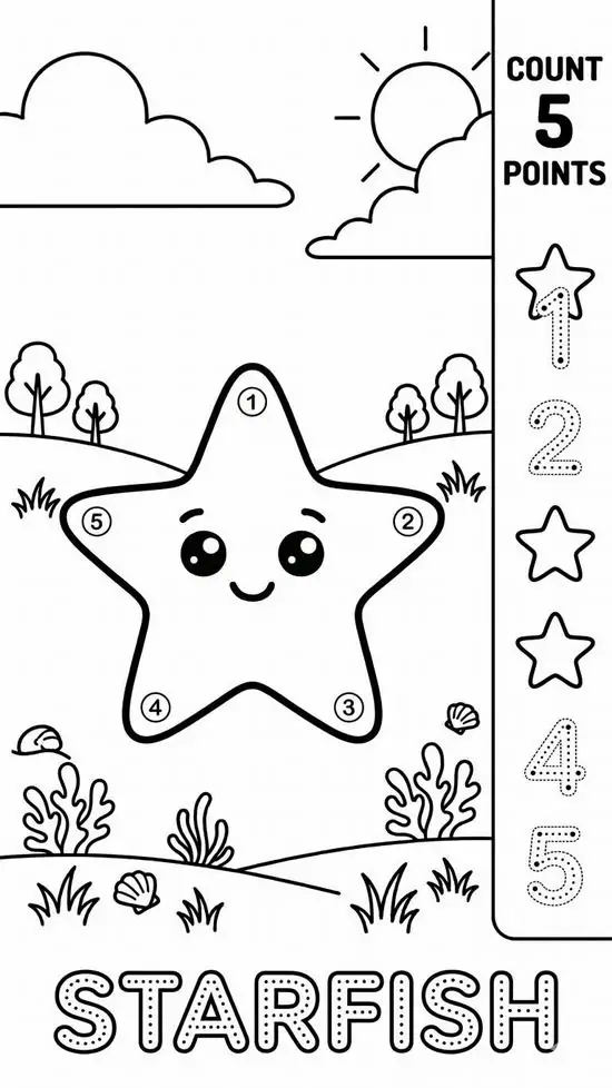 Điểm đặc trưng của sao biển là thân hình đối xứng tâm, thường có năm cánh tỏa ra từ đĩa trung tâm, mặt lưng da nhám có gai nhỏ, mặt dưới có nhiều chân ống giúp bám dính và di chuyển chậm rãi. Trong giới động vật tự nhiên, sao biển có màu rất nổi bật như cam, đỏ, xanh dương, vàng, tím, nên khi đưa vào tranh tô màu sẽ cực kỳ bắt mắt và dễ khơi gợi sáng tạo ở trẻ.