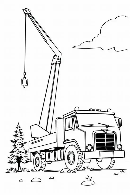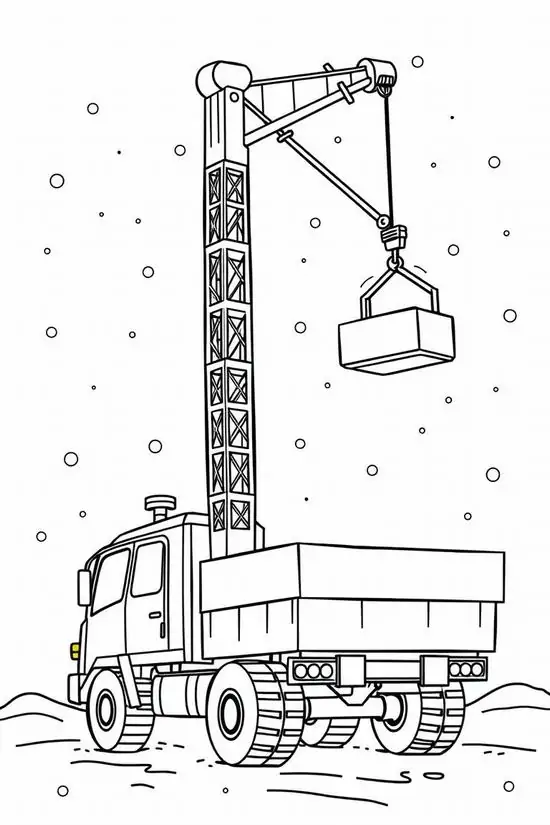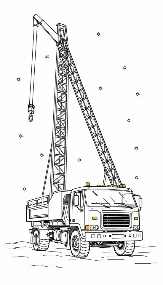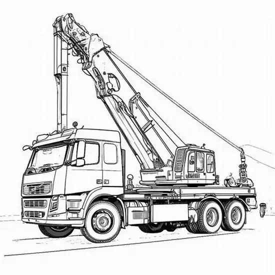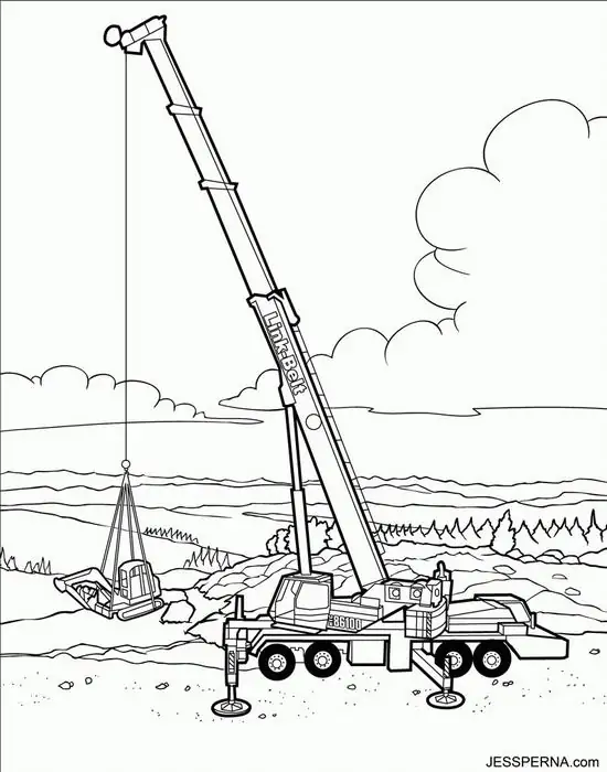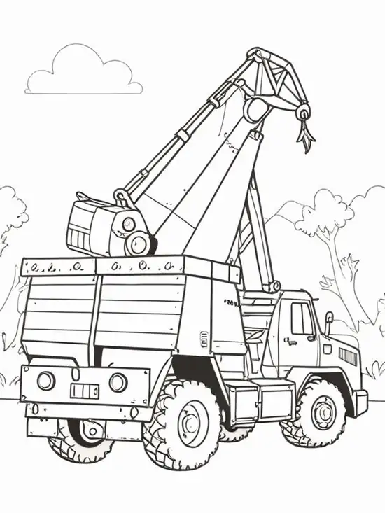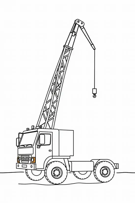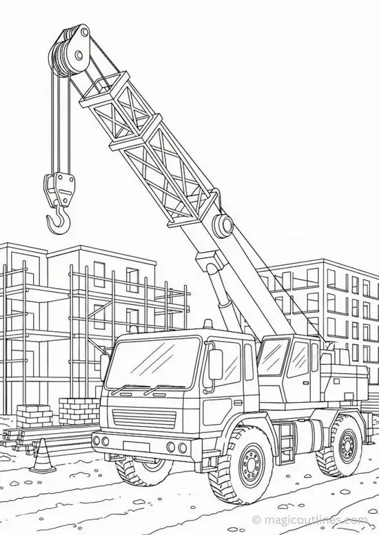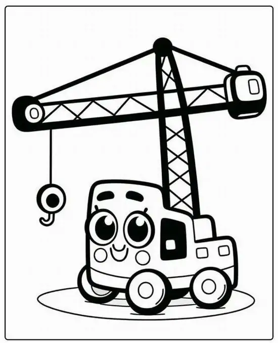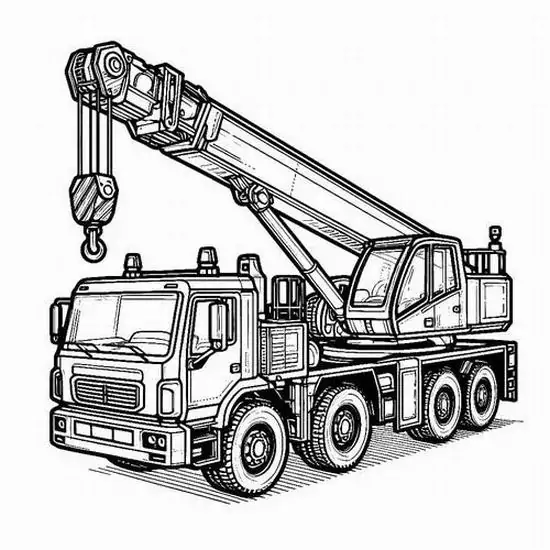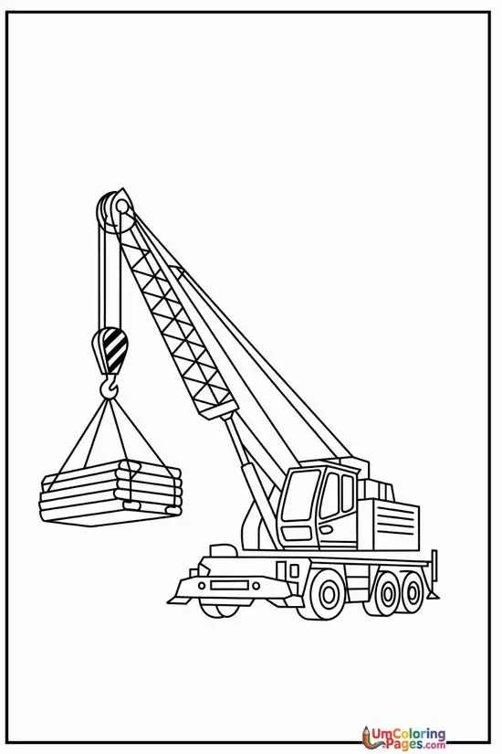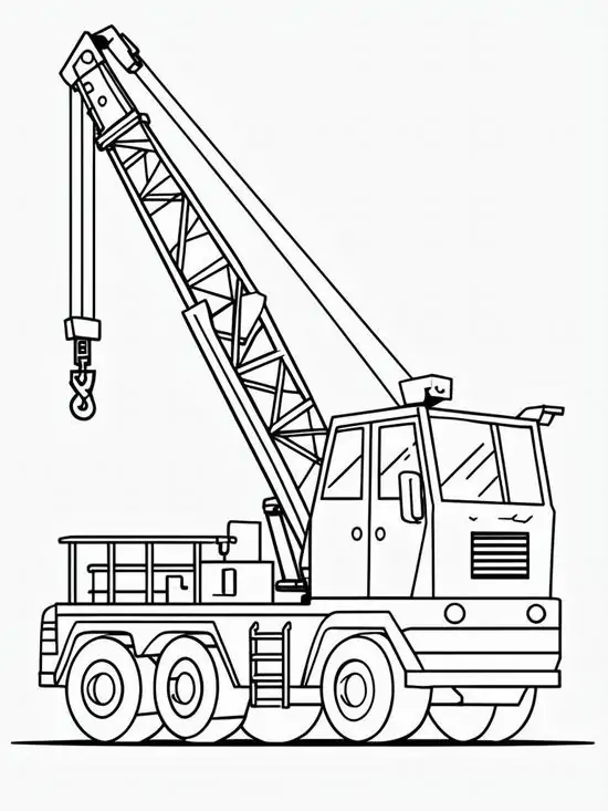 Tranh tô màu xe cần cẩu xoay quanh hình ảnh những phương tiện cơ giới xây dựng hạng nặng chuyên nâng hạ vật liệu tại công trường, bến bãi hoặc khu xây dựng. Màu sắc quen thuộc của xe cần cẩu thường là vàng, cam, đỏ, đen hoặc xanh công trình, nhìn rất nổi bật trên nền bê tông, cát sỏi và vật liệu xây dựng.