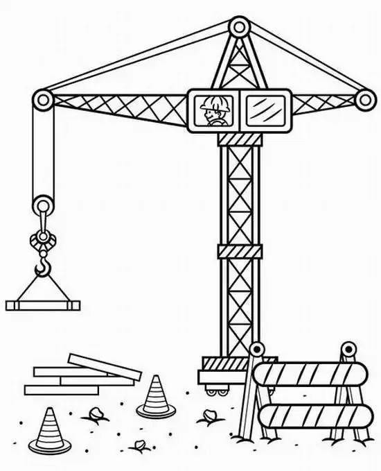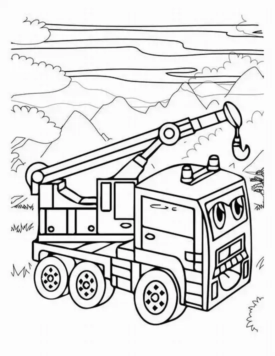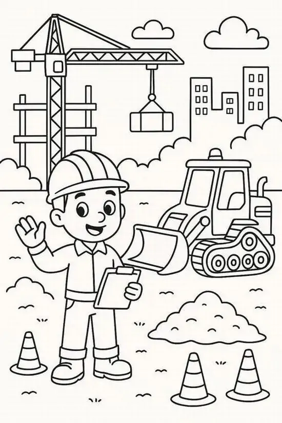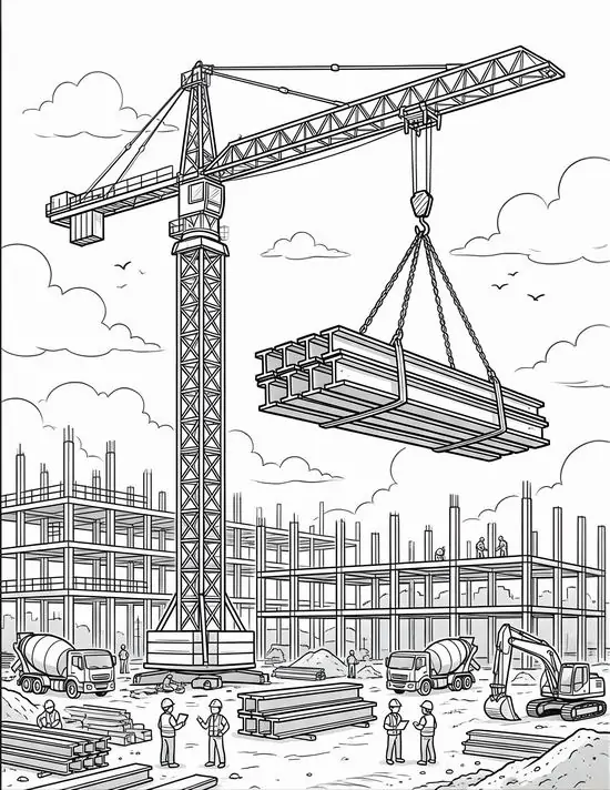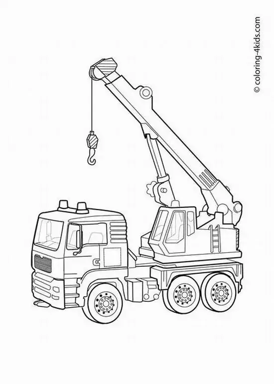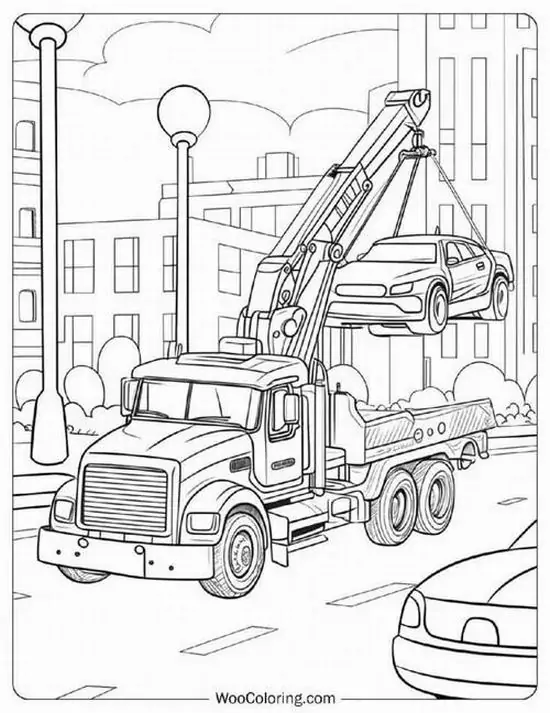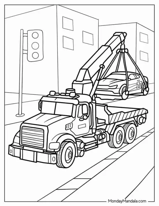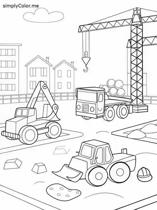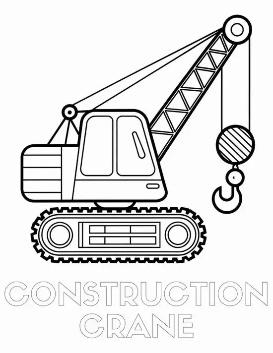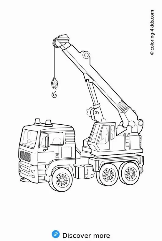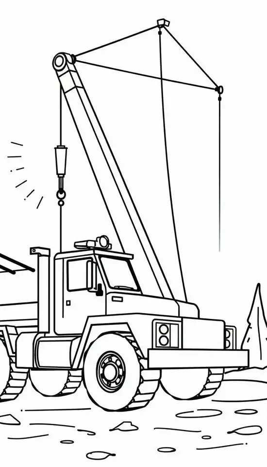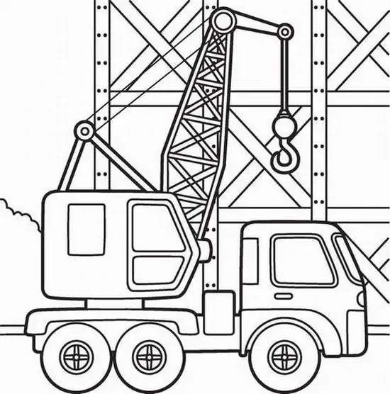 Tranh tô màu xe cần cẩu xoay quanh hình ảnh những phương tiện cơ giới xây dựng hạng nặng chuyên nâng hạ vật liệu tại công trường, bến bãi hoặc khu xây dựng. Màu sắc quen thuộc của xe cần cẩu thường là vàng, cam, đỏ, đen hoặc xanh công trình, nhìn rất nổi bật trên nền bê tông, cát sỏi và vật liệu xây dựng.