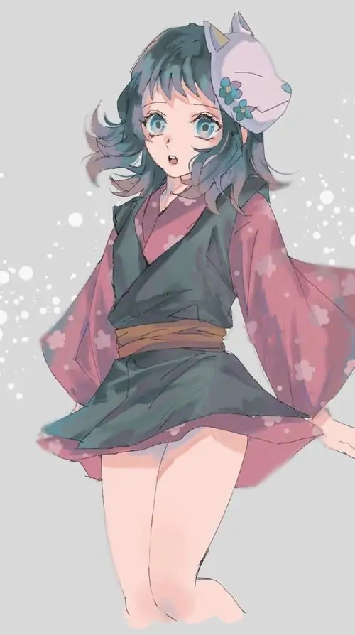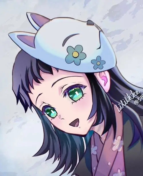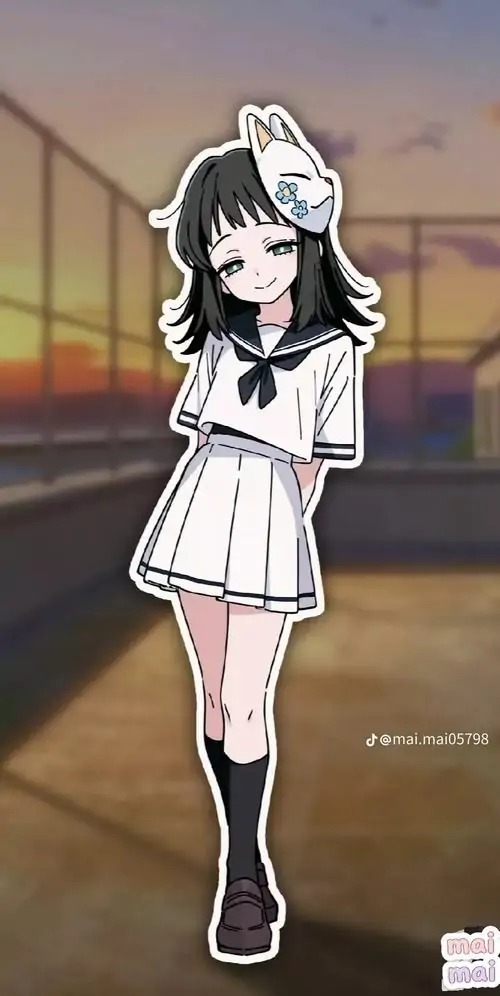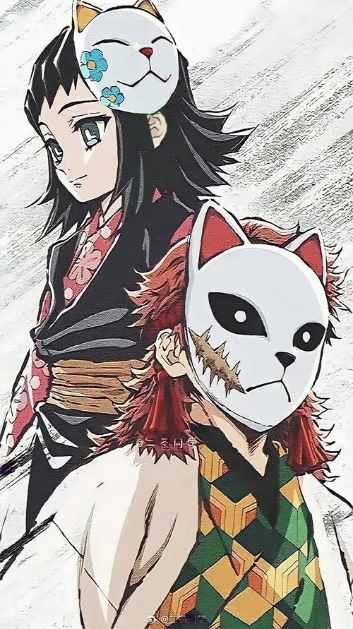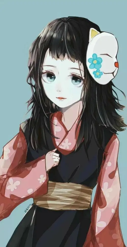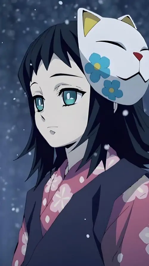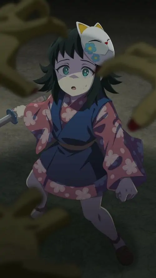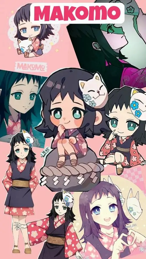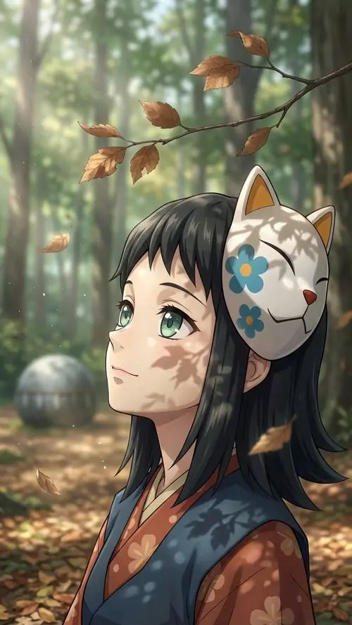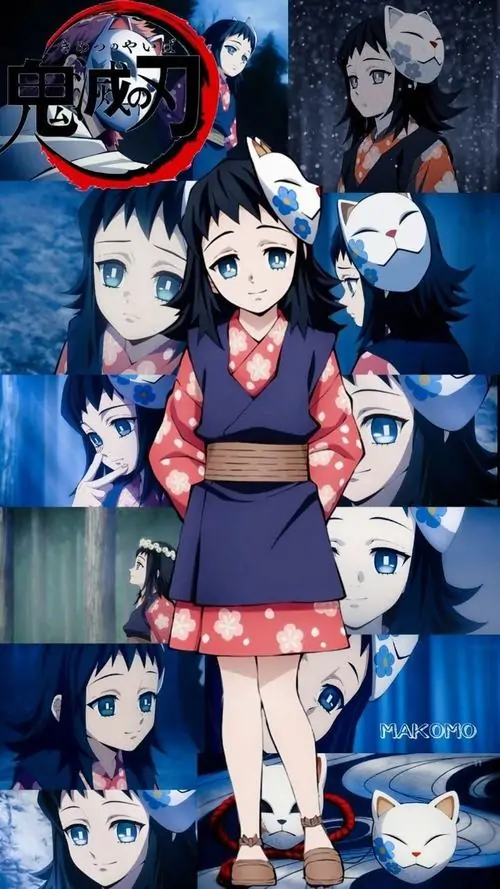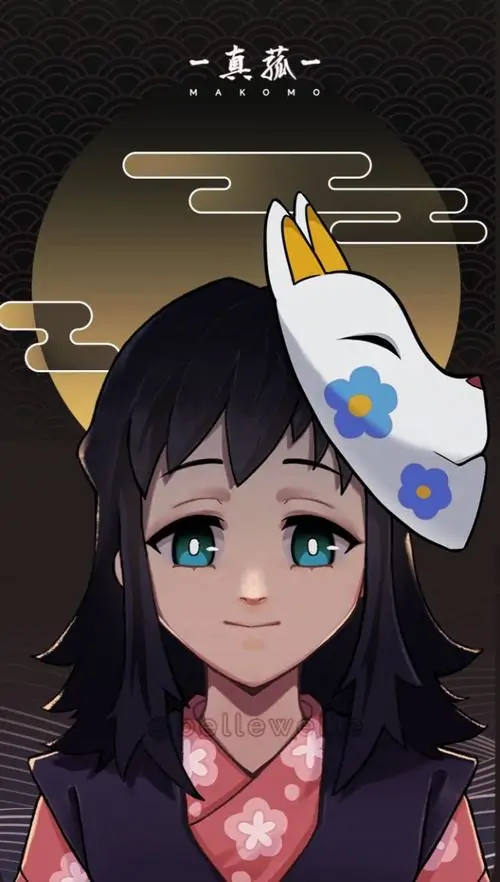 Chiếc mặt nạ cáo của Makomo là chi tiết nhận diện rất đắt, vừa gắn với Sakonji Urokodaki, vừa mang cảm giác bảo hộ theo văn hóa dân gian Nhật Bản. Họa tiết hoa đào bên má khiến chiếc mặt nạ không lạnh lùng mà mềm hơn, nữ tính hơn. Trong nhiều hình ảnh Makomo, chiếc mặt nạ không chỉ là phụ kiện. Nó giống một phần linh hồn của cô, nhắc về những đứa trẻ từng được Urokodaki yêu thương và gửi gắm hy vọng.