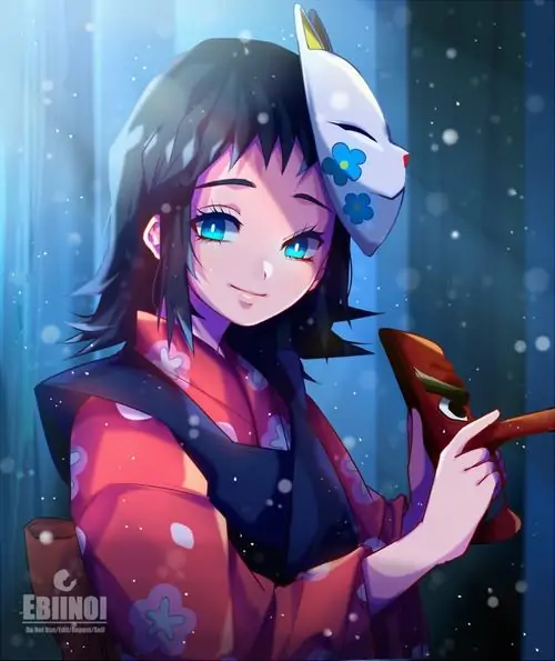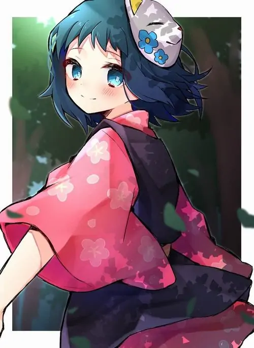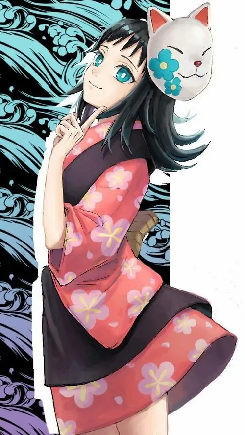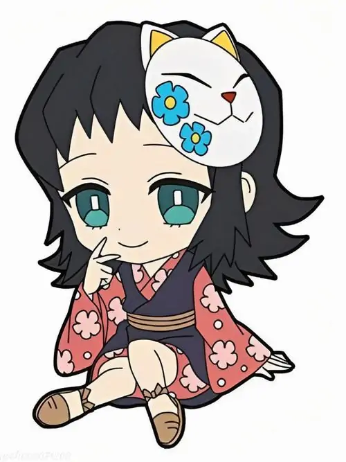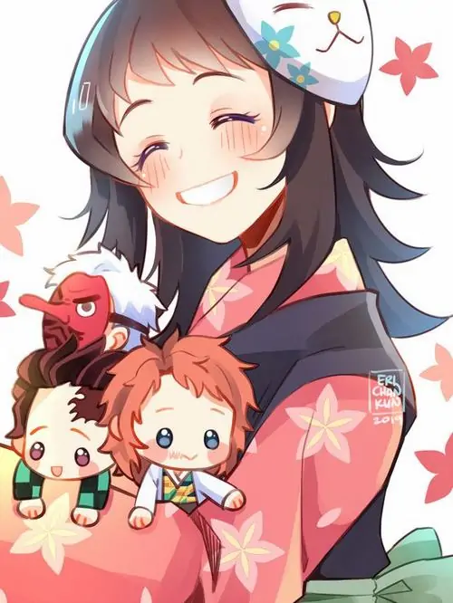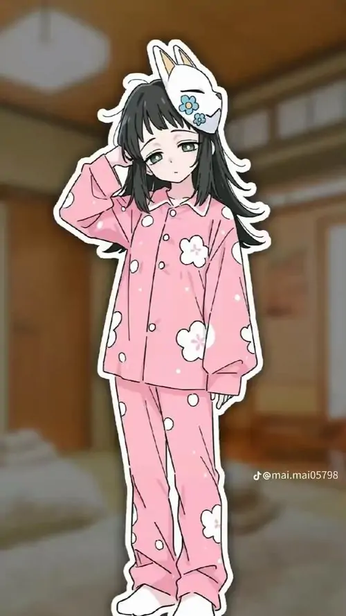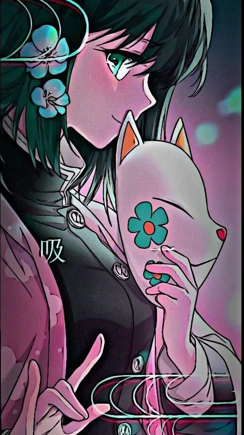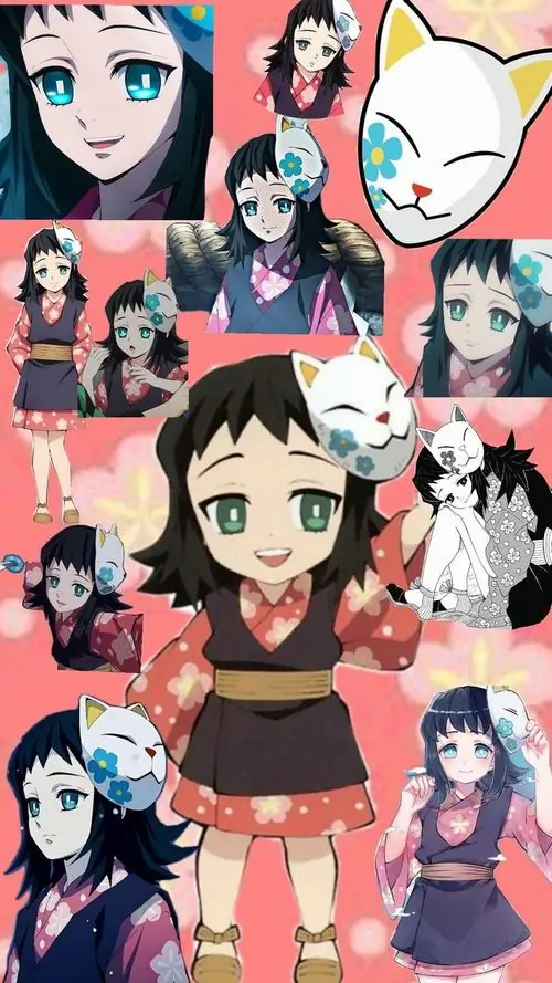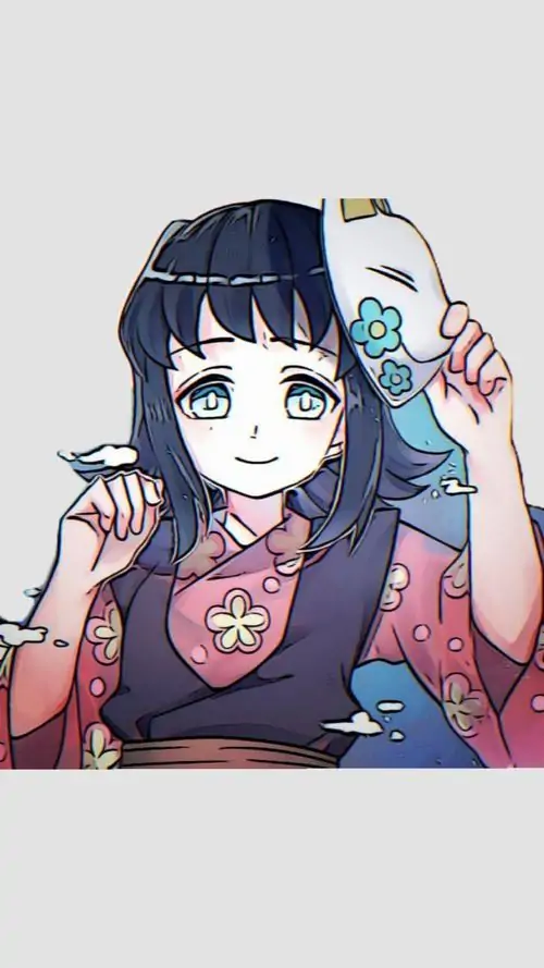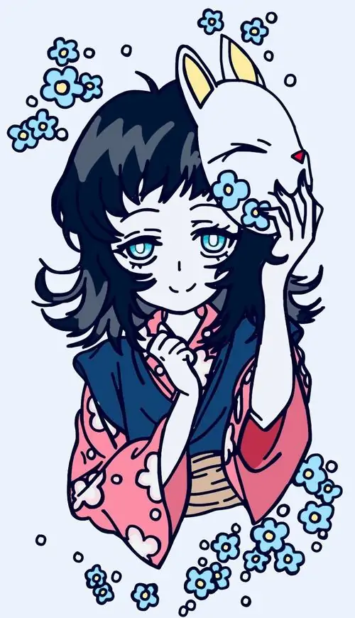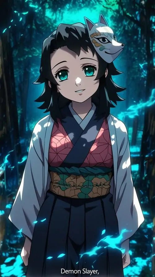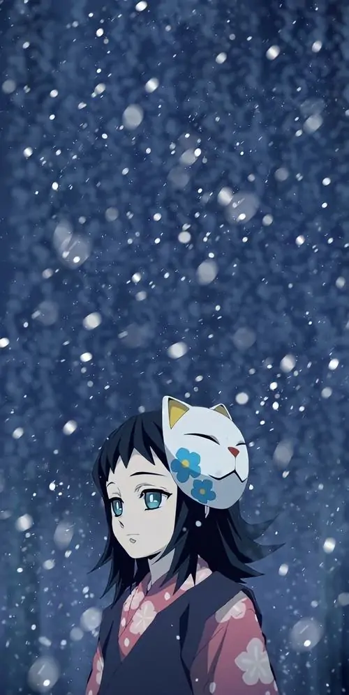 Chiếc mặt nạ cáo của Makomo là chi tiết nhận diện rất đắt, vừa gắn với Sakonji Urokodaki, vừa mang cảm giác bảo hộ theo văn hóa dân gian Nhật Bản. Họa tiết hoa đào bên má khiến chiếc mặt nạ không lạnh lùng mà mềm hơn, nữ tính hơn. Trong nhiều hình ảnh Makomo, chiếc mặt nạ không chỉ là phụ kiện. Nó giống một phần linh hồn của cô, nhắc về những đứa trẻ từng được Urokodaki yêu thương và gửi gắm hy vọng.