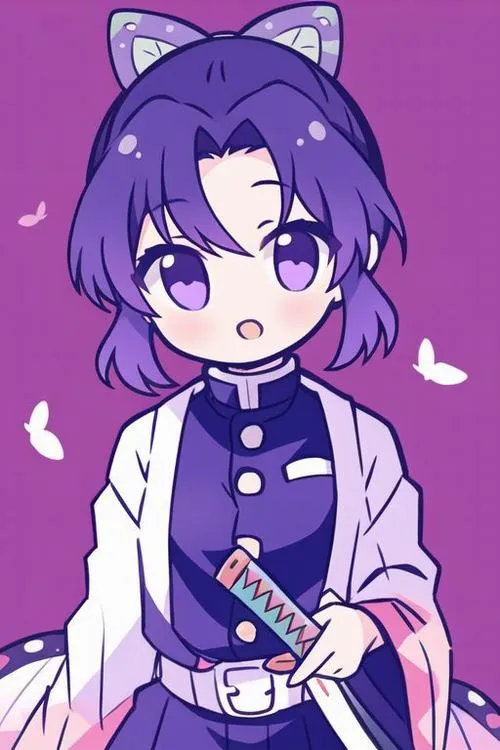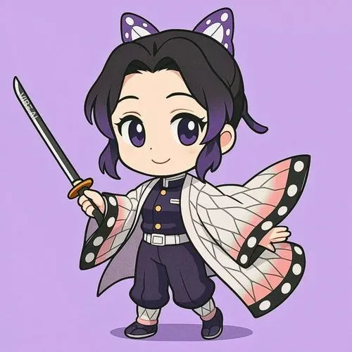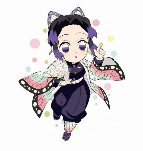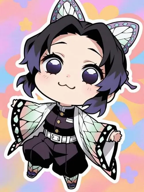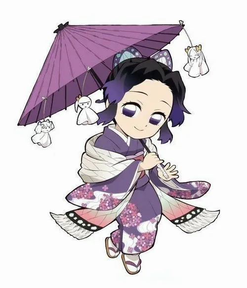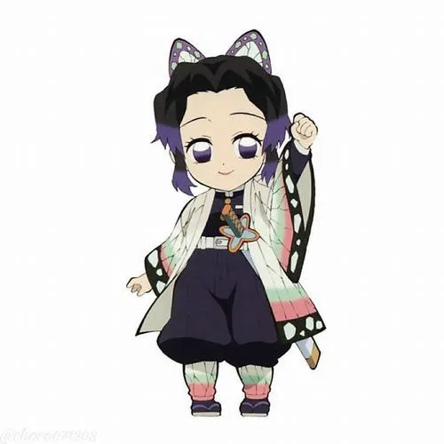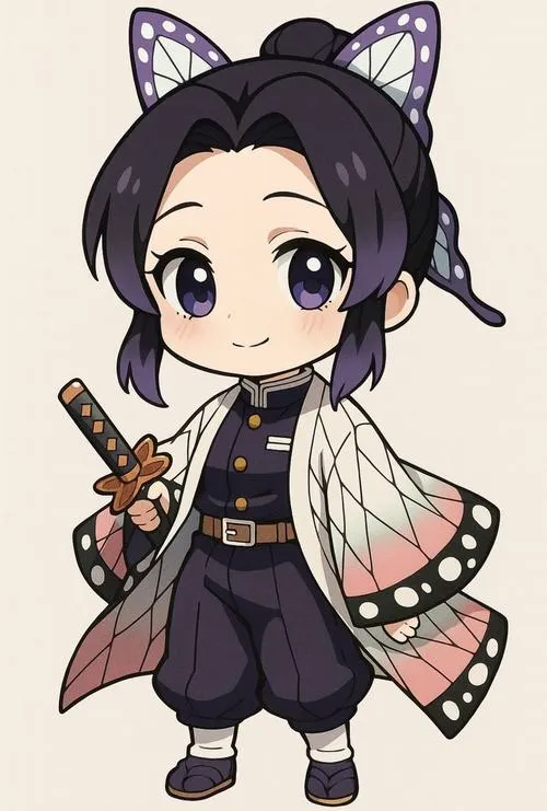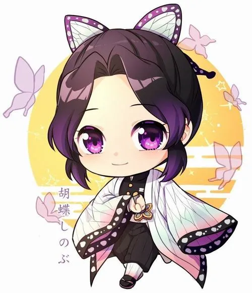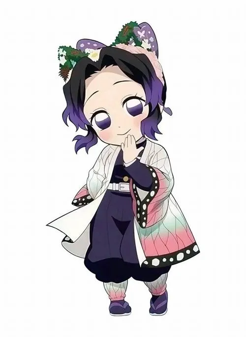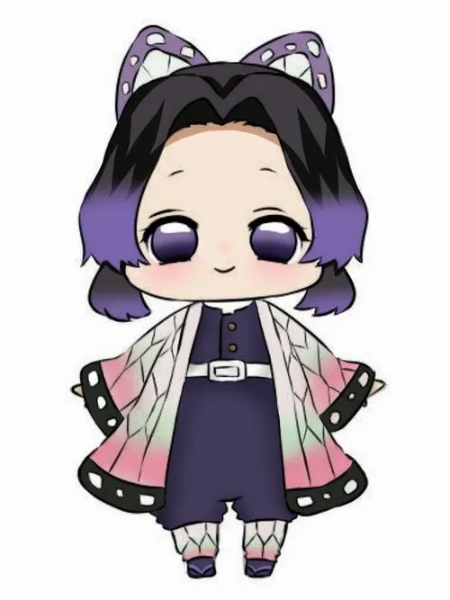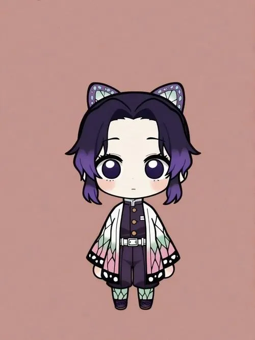 Bộ ảnh Shinobu chibi là tập hợp những hình minh họa lấy cảm hứng từ Shinobu Kocho trong bộ ảnh Kimetsu no Yaiba, nhưng được biến tấu theo phong cách đầu to người nhỏ đáng yêu. Điểm nổi bật nằm ở đôi mắt tím long lanh, tóc búi cao gọn gàng, kẹp tóc hình bướm, áo haori họa tiết cánh bướm và thanh kiếm Nichirin mảnh mai được thu nhỏ.