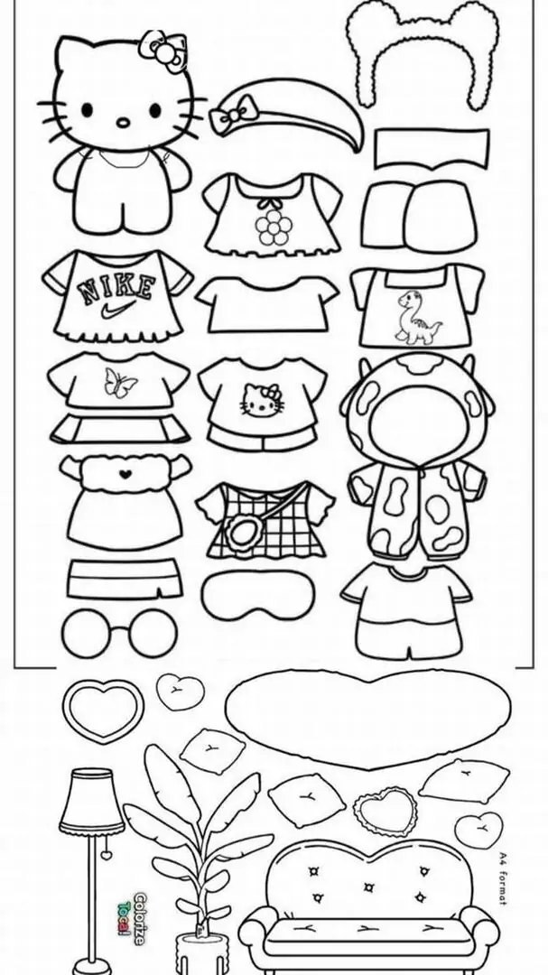 Bộ tranh này giống như một cửa hàng thời trang tí hon nằm gọn trên trang giấy trắng. Ở đó có Hello Kitty đứng chờ, có váy áo bốn mùa, có nơ, mũ, túi xách và cả những ý tưởng ngộ nghĩnh do bé tự nghĩ ra. Arte y Cultura TV mang đến chủ đề tranh tô màu búp bê giấy Hello Kitty thay đồ như một cách để giờ tô màu không còn đứng yên, mà sống động hẳn lên.