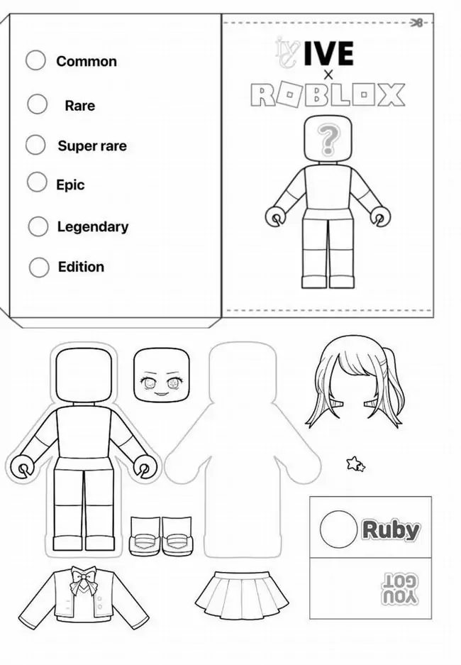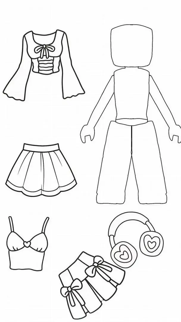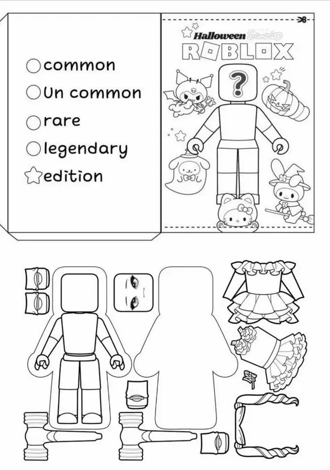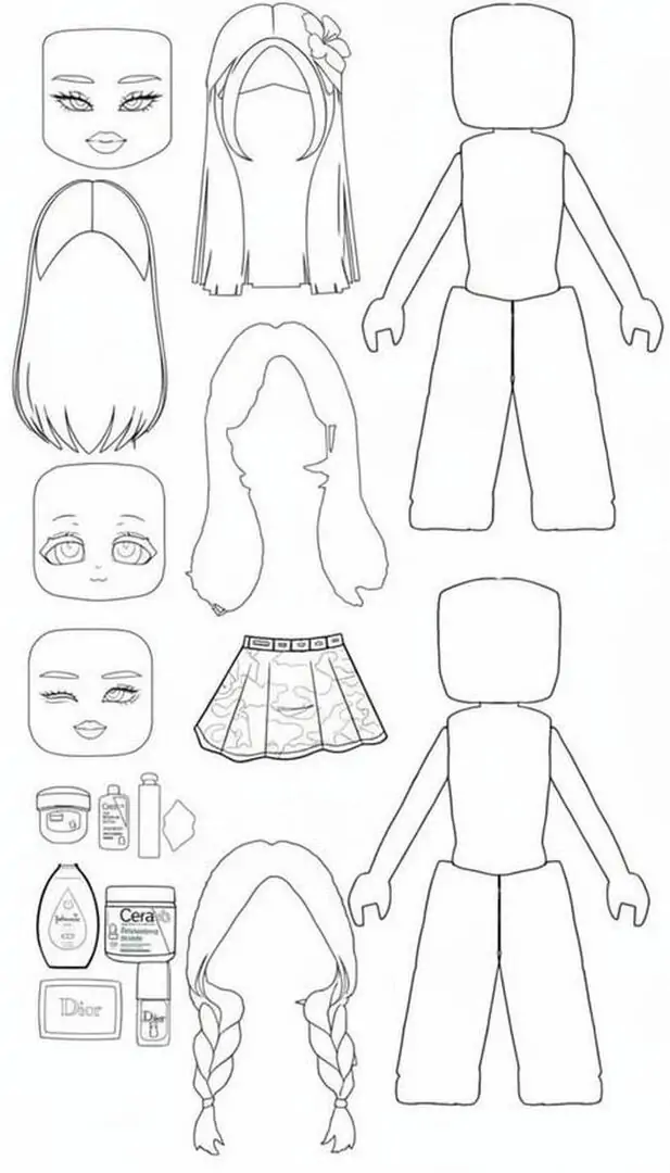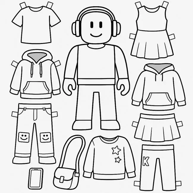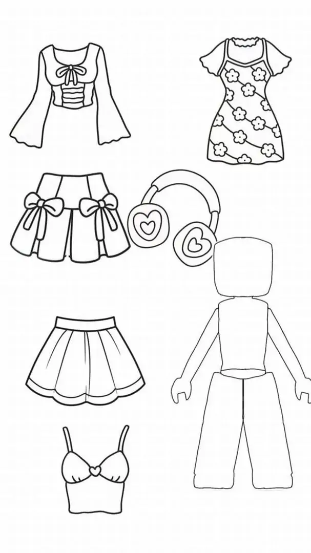 Bộ tranh tô màu búp bê giấy Roblox thay đồ thường gồm một nhân vật cơ bản đi kèm nhiều váy áo, tóc, mũ, giày, thú cưng, cánh hoặc phụ kiện trang trí trên cùng bộ giấy. Nét vẽ rõ, dễ tô, dễ cắt dán nên rất hợp cho giờ chơi tại nhà hoặc hoạt động cuối tuần.