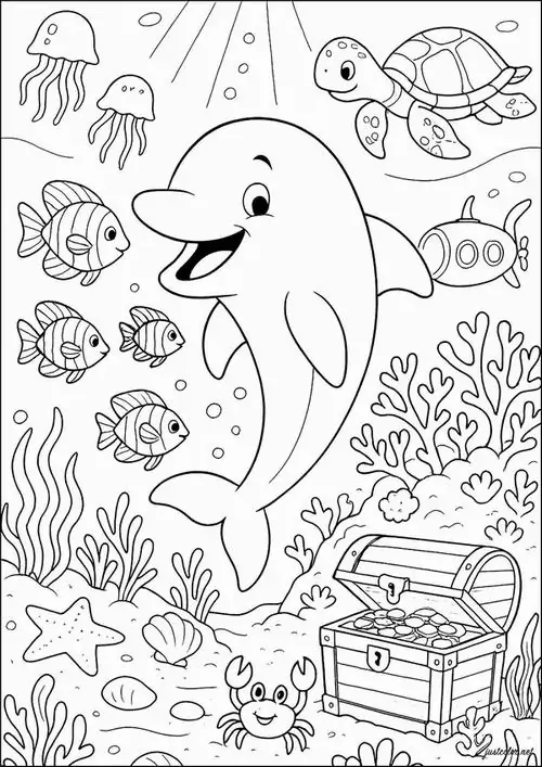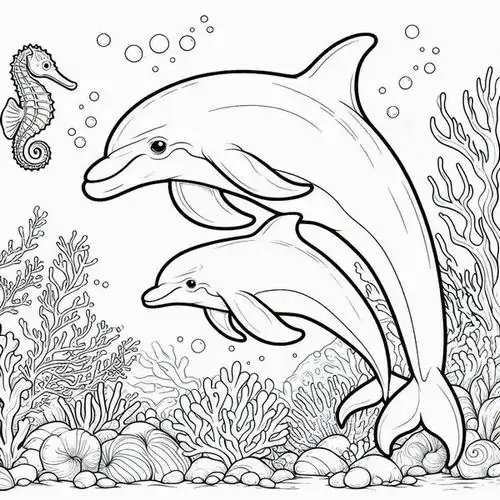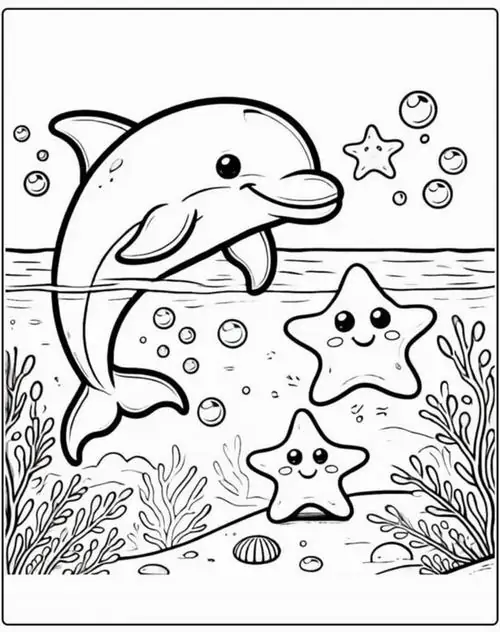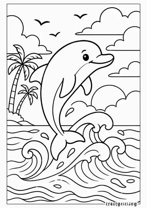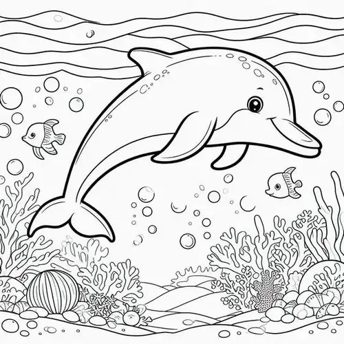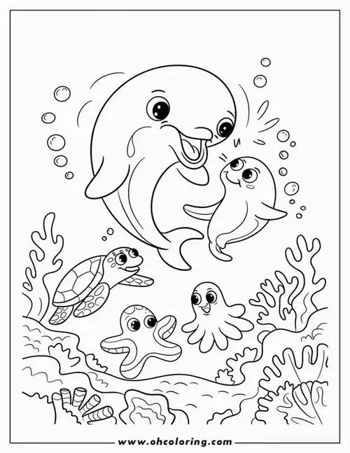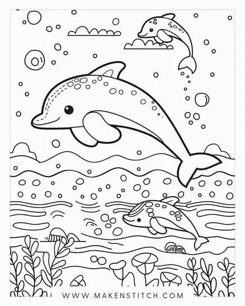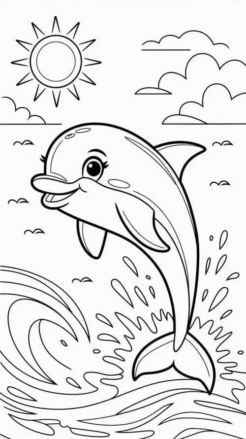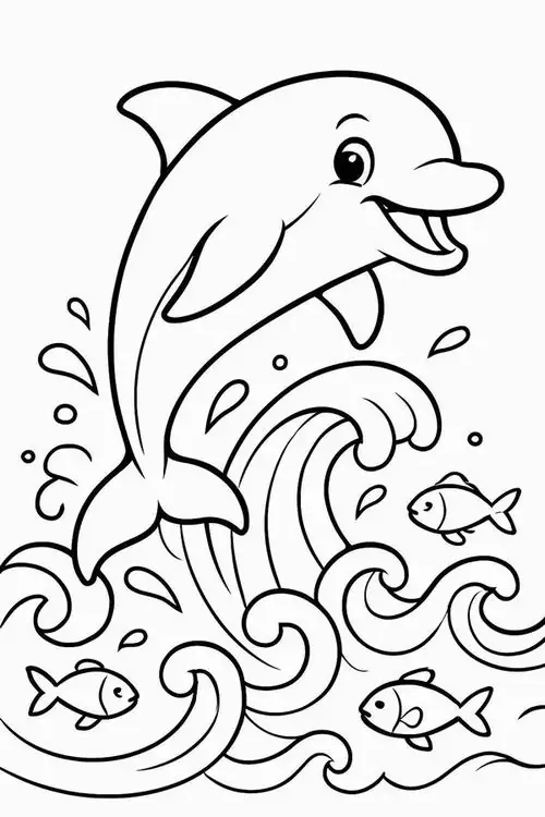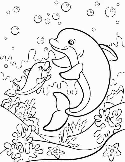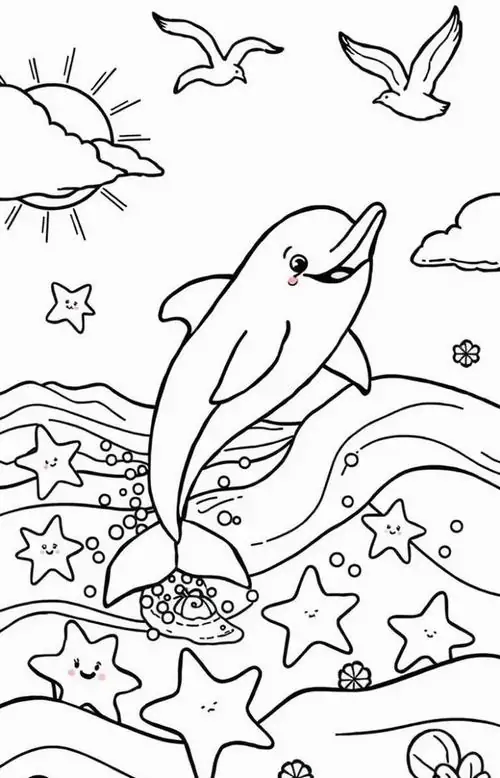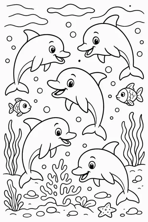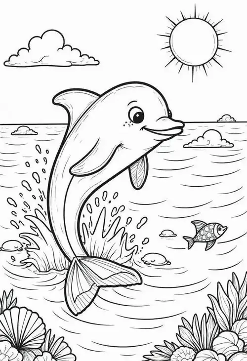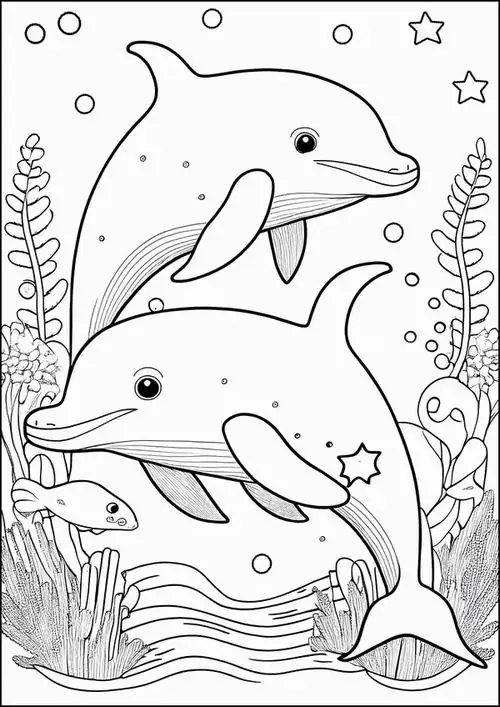 Bộ tranh tô màu cá heo gồm nhiều khung cảnh gần gũi và sinh động như cá heo mũi chai nhảy qua mặt sóng, heo biển bơi cạnh rạn san hô, cá heo vui đùa cùng thợ lặn, mẹ con cá heo đi theo bầy, hay cảnh thủy cung với sao biển, cá nhỏ và bọt nước trắng xóa. Mỗi bức tranh đều có đường nét rõ, dễ tô, hợp cho bé thích động vật biển thông minh và yêu màu xanh của đại dương.