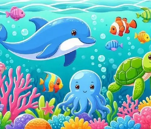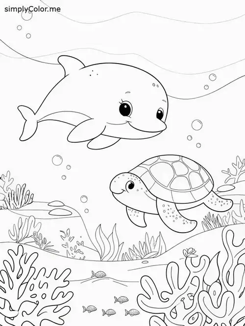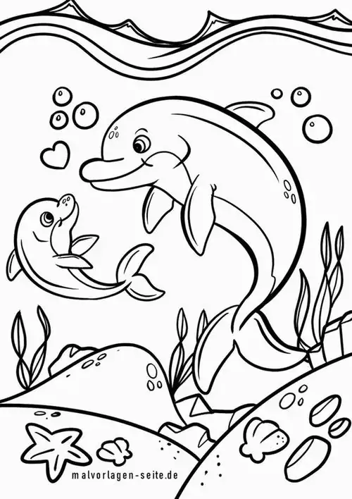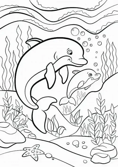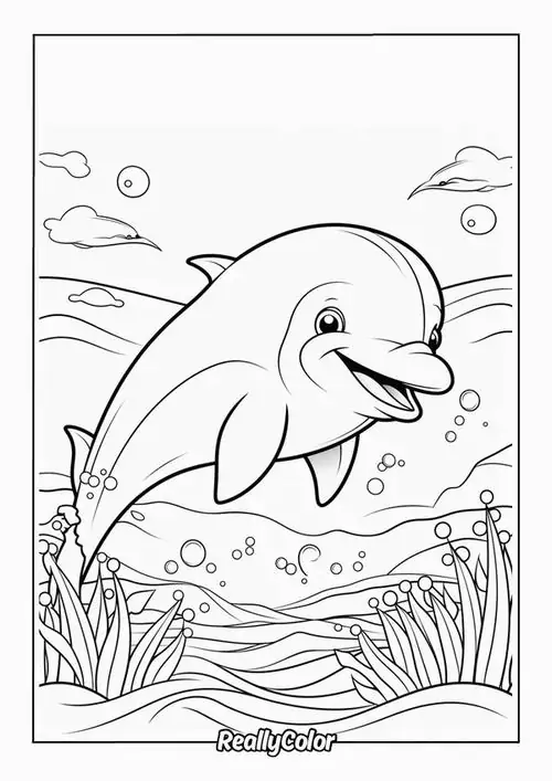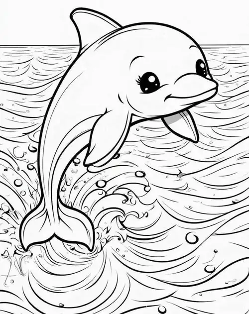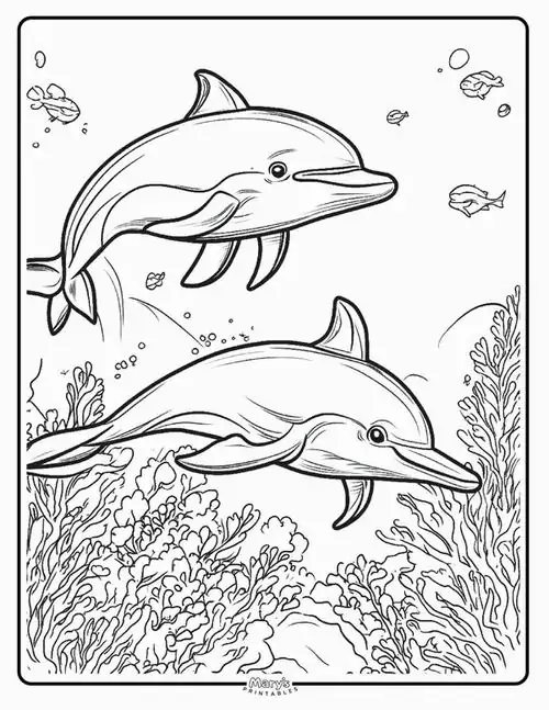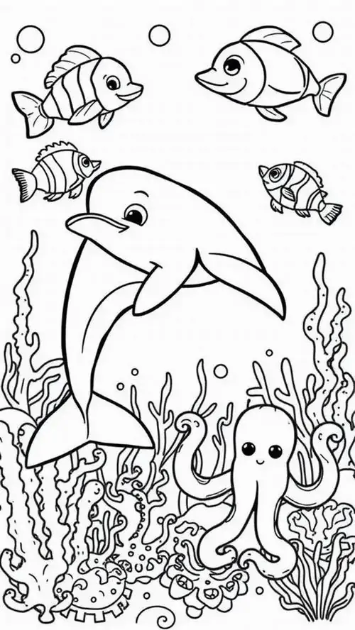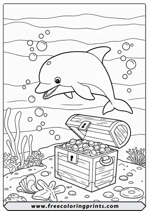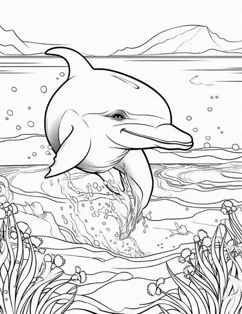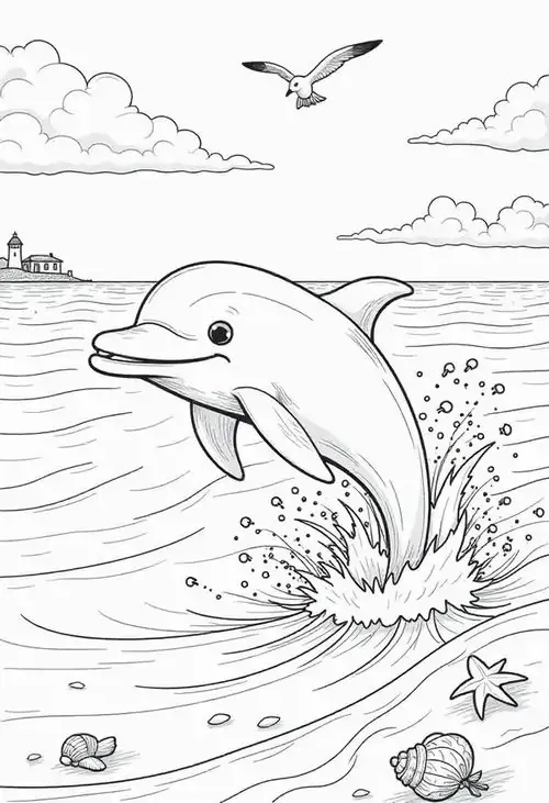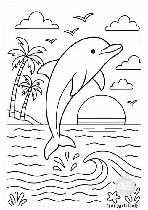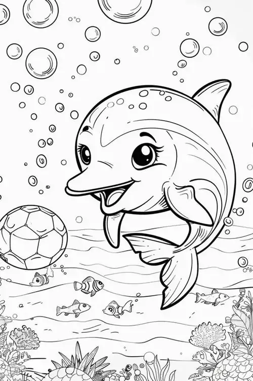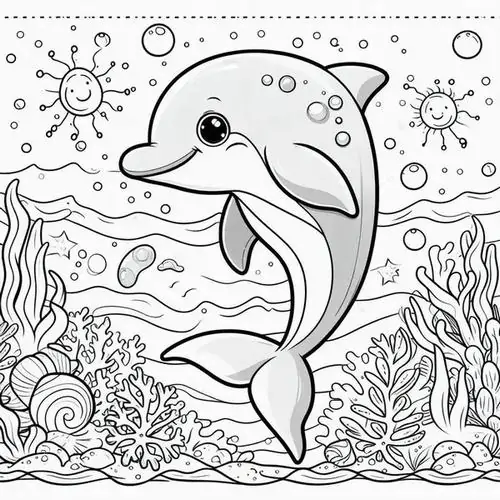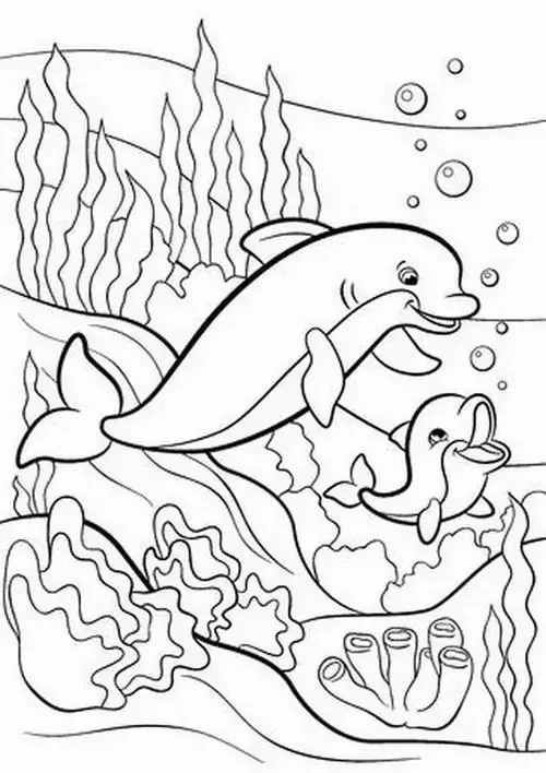 Bộ tranh tô màu cá heo gồm nhiều khung cảnh gần gũi và sinh động như cá heo mũi chai nhảy qua mặt sóng, heo biển bơi cạnh rạn san hô, cá heo vui đùa cùng thợ lặn, mẹ con cá heo đi theo bầy, hay cảnh thủy cung với sao biển, cá nhỏ và bọt nước trắng xóa. Mỗi bức tranh đều có đường nét rõ, dễ tô, hợp cho bé thích động vật biển thông minh và yêu màu xanh của đại dương.