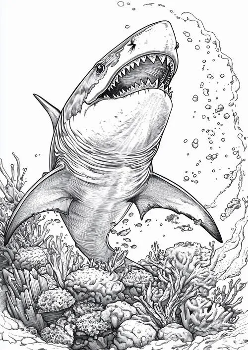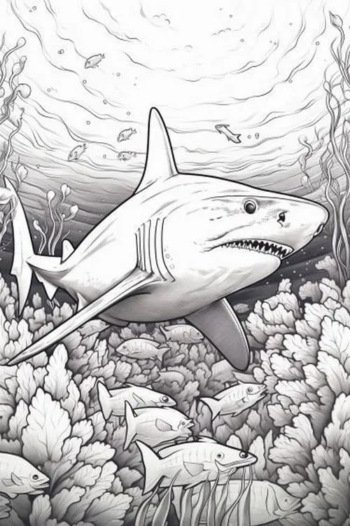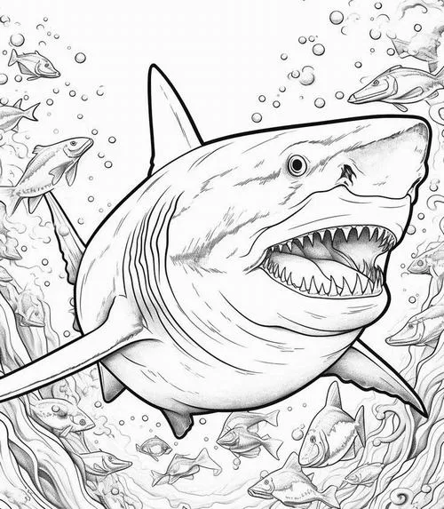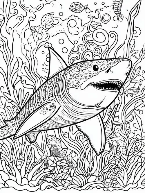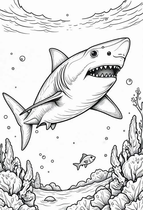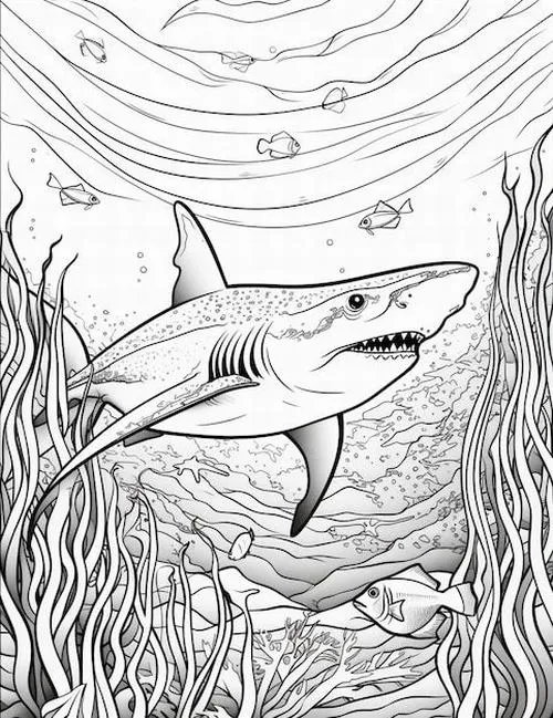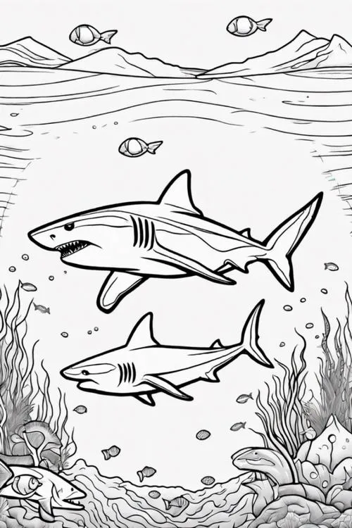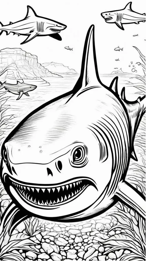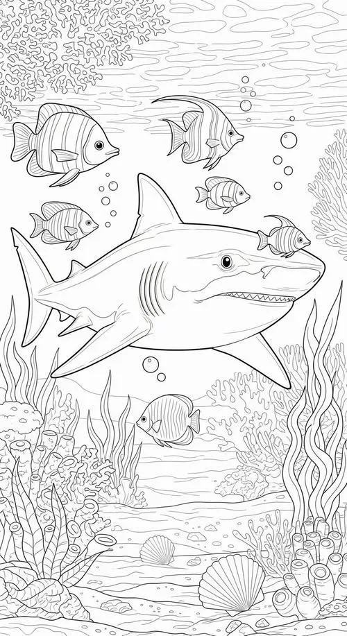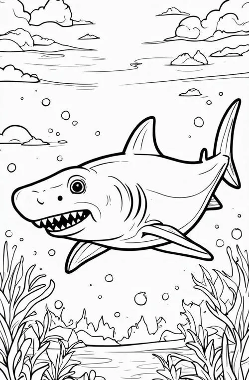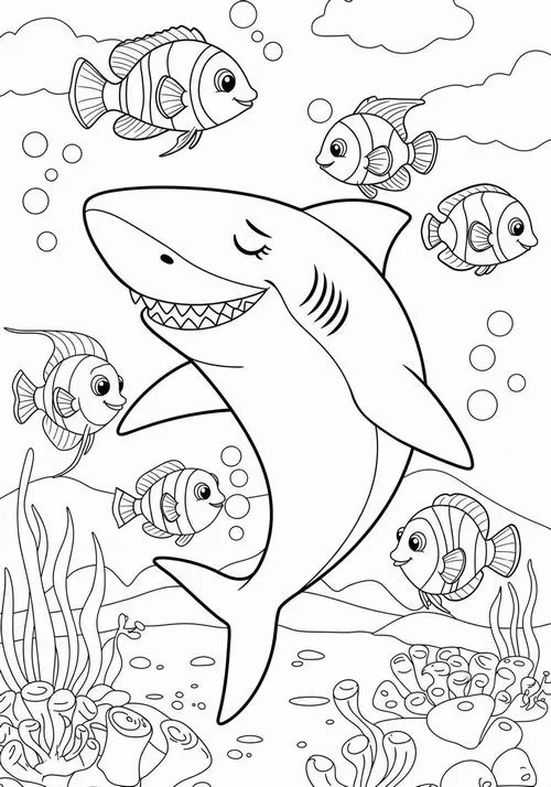 Bộ tranh tô màu cá mập gồm nhiều mẫu từ hình vẽ cá mập chưa tô màu đơn giản cho bé mới tập, đến tranh đen trắng chủ đề cá mập có rạn san hô, tàu ngầm, mỏ neo, vỏ ốc và sóng biển cho bé lớn hơn. Có mẫu cá mập trắng đại dương, cá mập đầu búa, cá mập voi, Megalodon và cả Baby Shark vui nhộn. Nét vẽ rõ, khoảng trống hợp lý, rất dễ tô bằng bút sáp, chì màu hay màu nước.