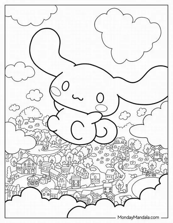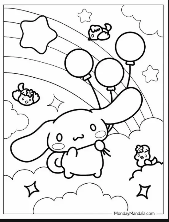 Điều làm Cinnamoroll nổi bật không phải sự cầu kỳ mà là vẻ hiền hòa, đôi tai dài bồng bềnh, mắt xanh dịu, má hồng nhẹ và chiếc đuôi xoắn như bánh cuộn rất dễ nhận ra. Khi vào tranh tô màu, nhân vật này đặc biệt hợp với bé từ khoảng 3 4 tuổi đến 9 tuổi vì đường nét dễ nhìn, biểu cảm dịu dàng, ít chi tiết rối mắt nhưng vẫn đủ không gian cho con sáng tạo.