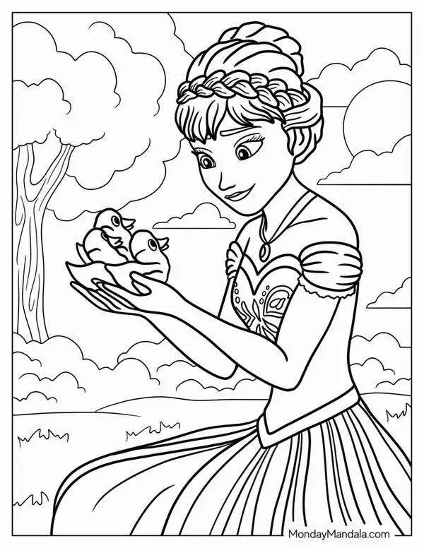 Bộ tranh tô màu công chúa Anna thường gồm nhiều khung cảnh rất cuốn hút như Anna đứng trong lâu đài Arendelle, Anna cười cùng Olaf, Anna phiêu lưu với Kristoff và Sven, hoặc Anna bên Elsa trong khoảnh khắc tình chị em ấm áp. Nét vẽ rõ, hình dễ tô, phù hợp cả bé mới tập tô lẫn bé đã quen cầm bút màu.