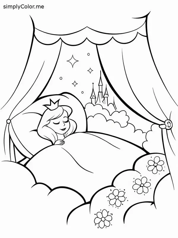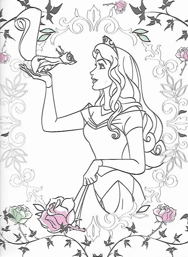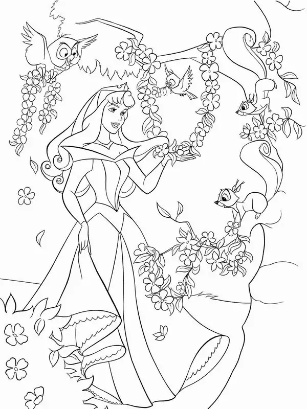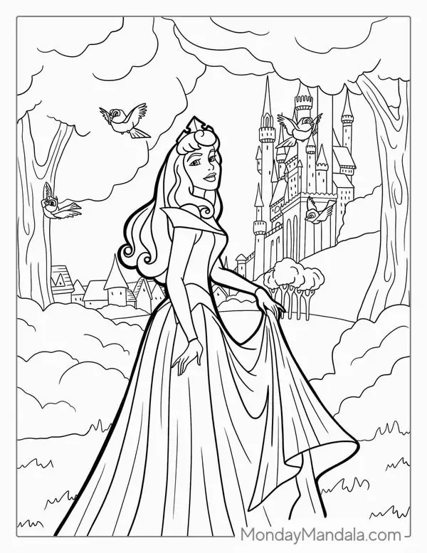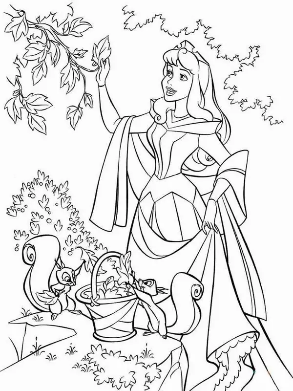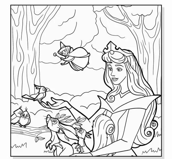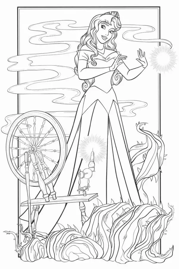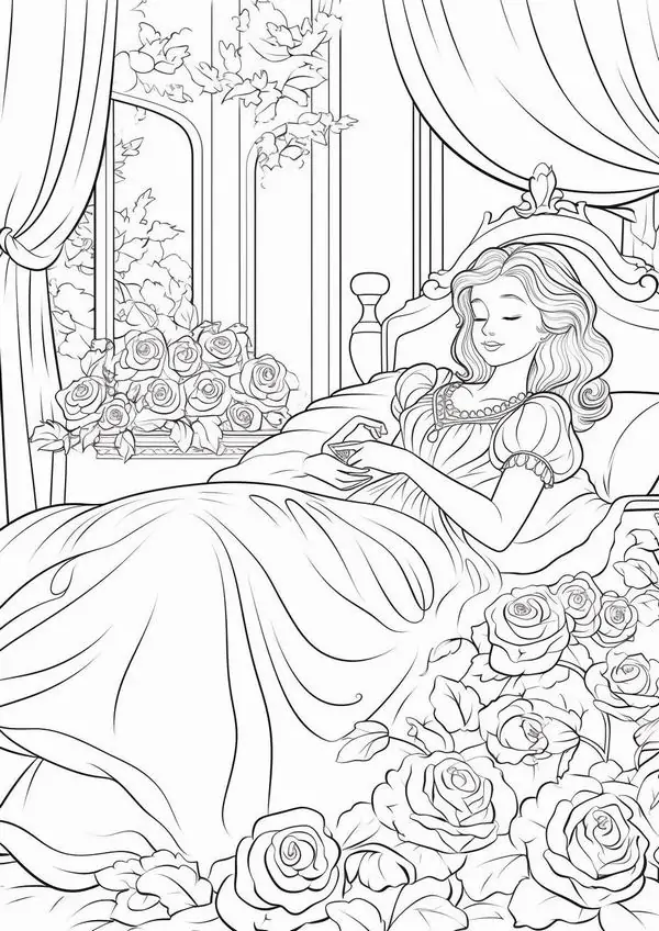 Tranh tô màu người đẹp ngủ trong rừng lấy cảm hứng từ truyện cổ tích nổi tiếng gắn với nàng Aurora, còn được biết đến với tên Briar Rose hay công chúa Hồng Hoa. Hình tượng này trở nên quen thuộc qua phiên bản hoạt hình Disney, nổi bật với vẻ đẹp thanh khiết, mái tóc vàng óng, chiếc váy dạ hội bồng bềnh và chiếc vương miện nhỏ tinh xảo.