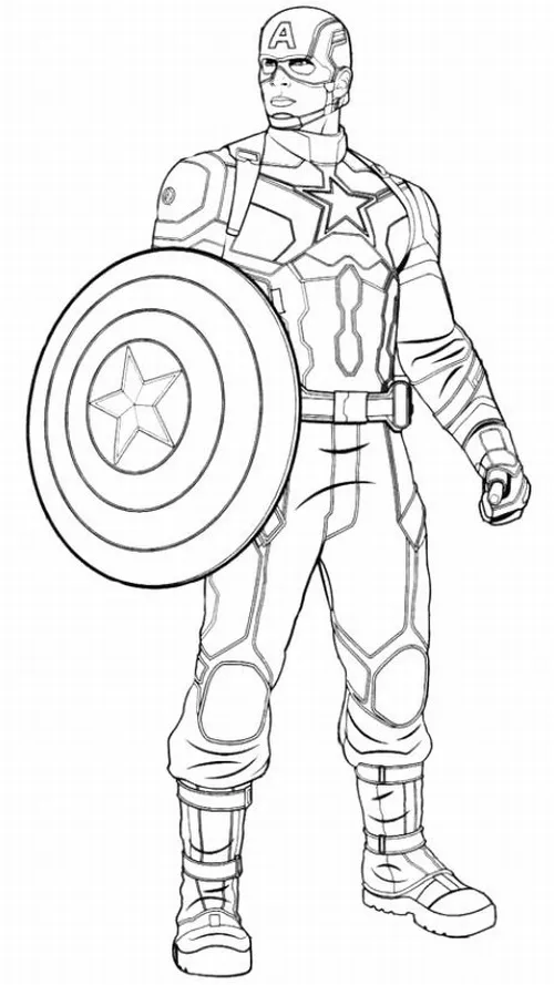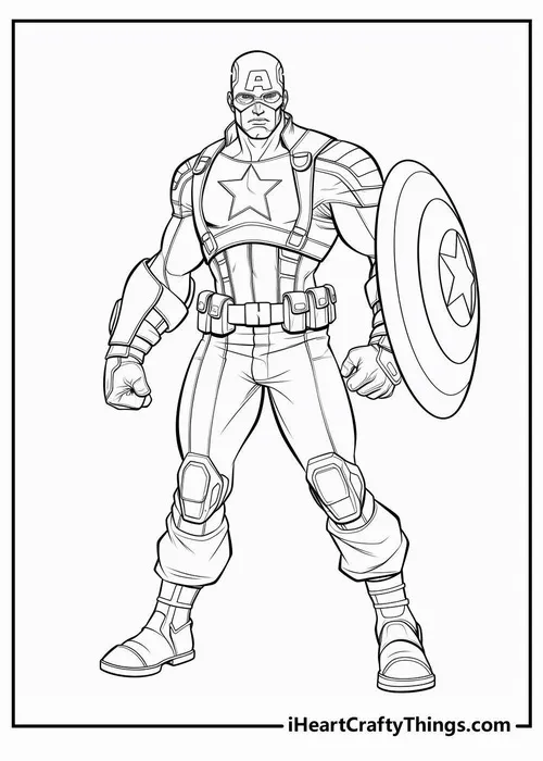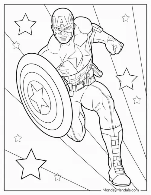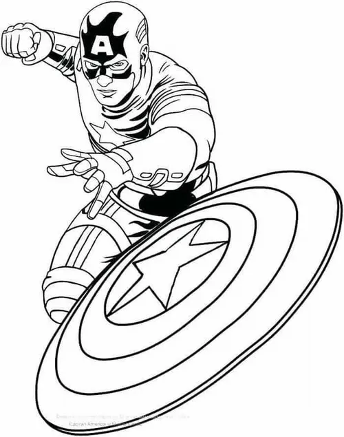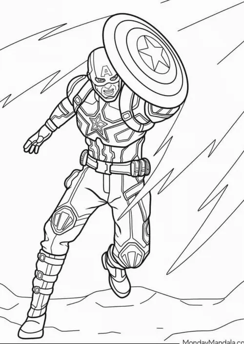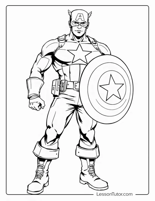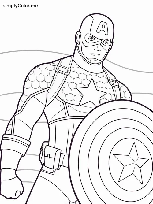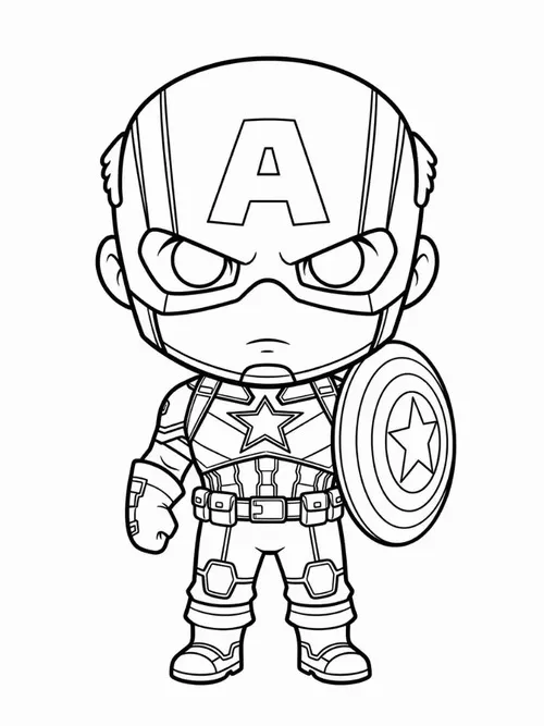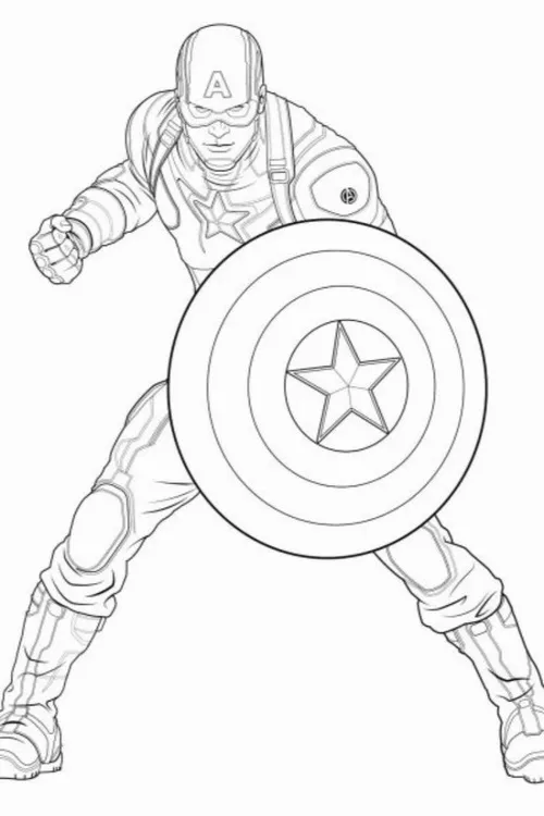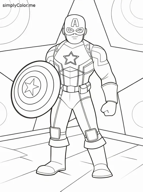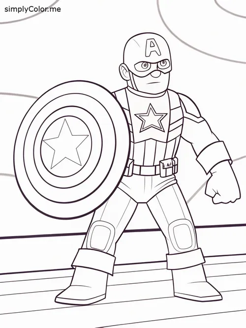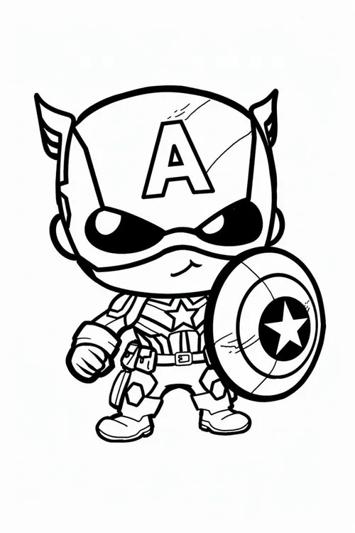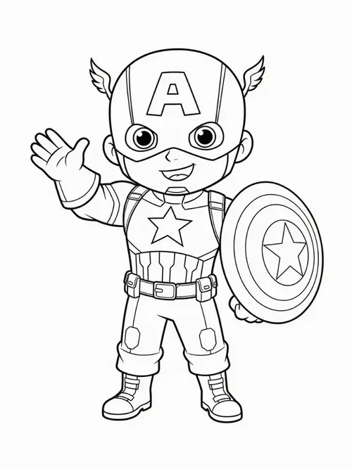 Chiếc khiên của đội trưởng Mỹ là chi tiết bé nào nhìn cũng nhận ra ngay. Hình tròn đồng tâm, ngôi sao trắng ở giữa và các lớp màu rõ ràng khiến nó trở thành phần rất vui để tô. Bé vừa học nhận diện hình học, vừa rèn khả năng tô đều trong các mảng cong.