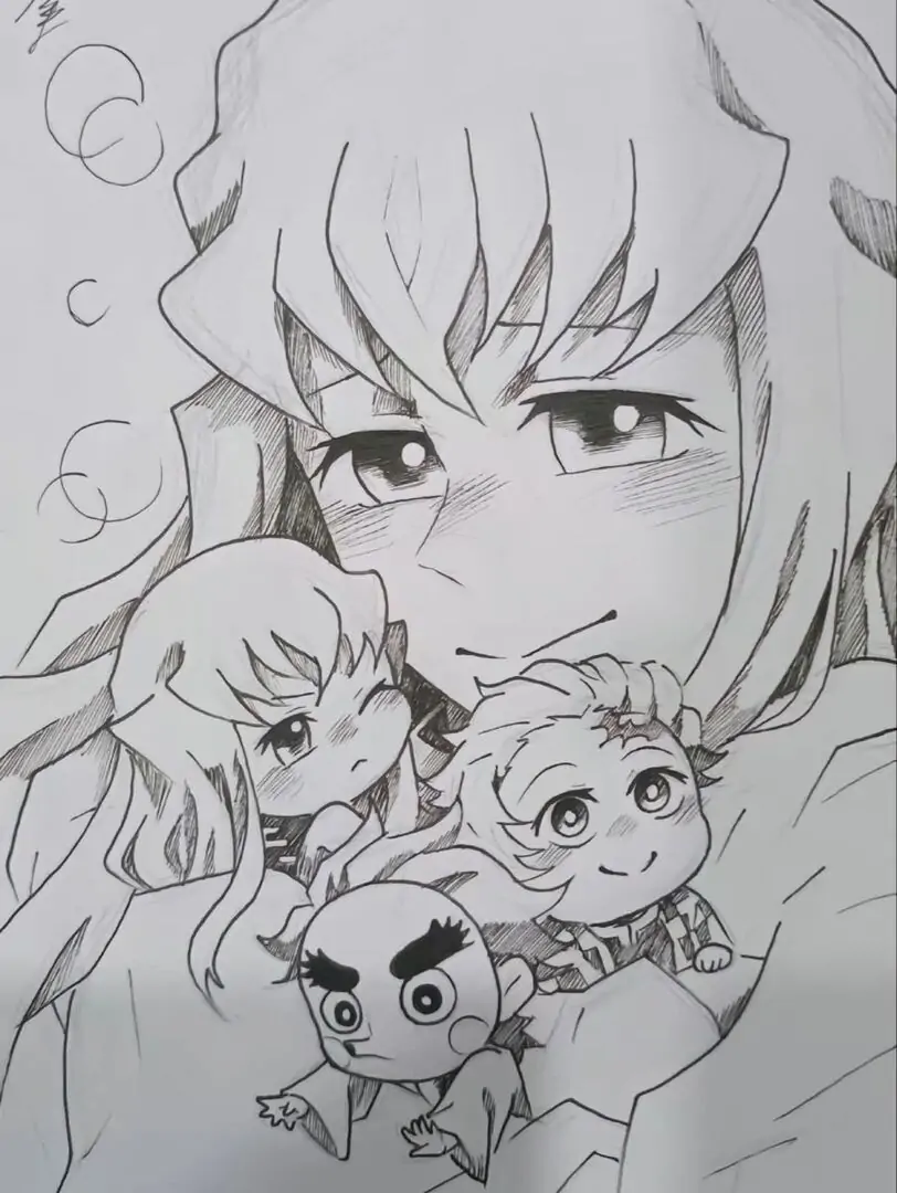 Muichirou không nhất thiết lúc nào cũng phải đúng màu trong truyện. Bé có thể thử tóc xanh biển, mắt bạc tím, đồng phục xám khói hoặc sương mù hồng nhạt. Tranh tô màu là nơi trí tưởng tượng được chạy nhảy mà. Miễn bé kể được câu chuyện của mình, bức tranh ấy đã rất đáng yêu.
